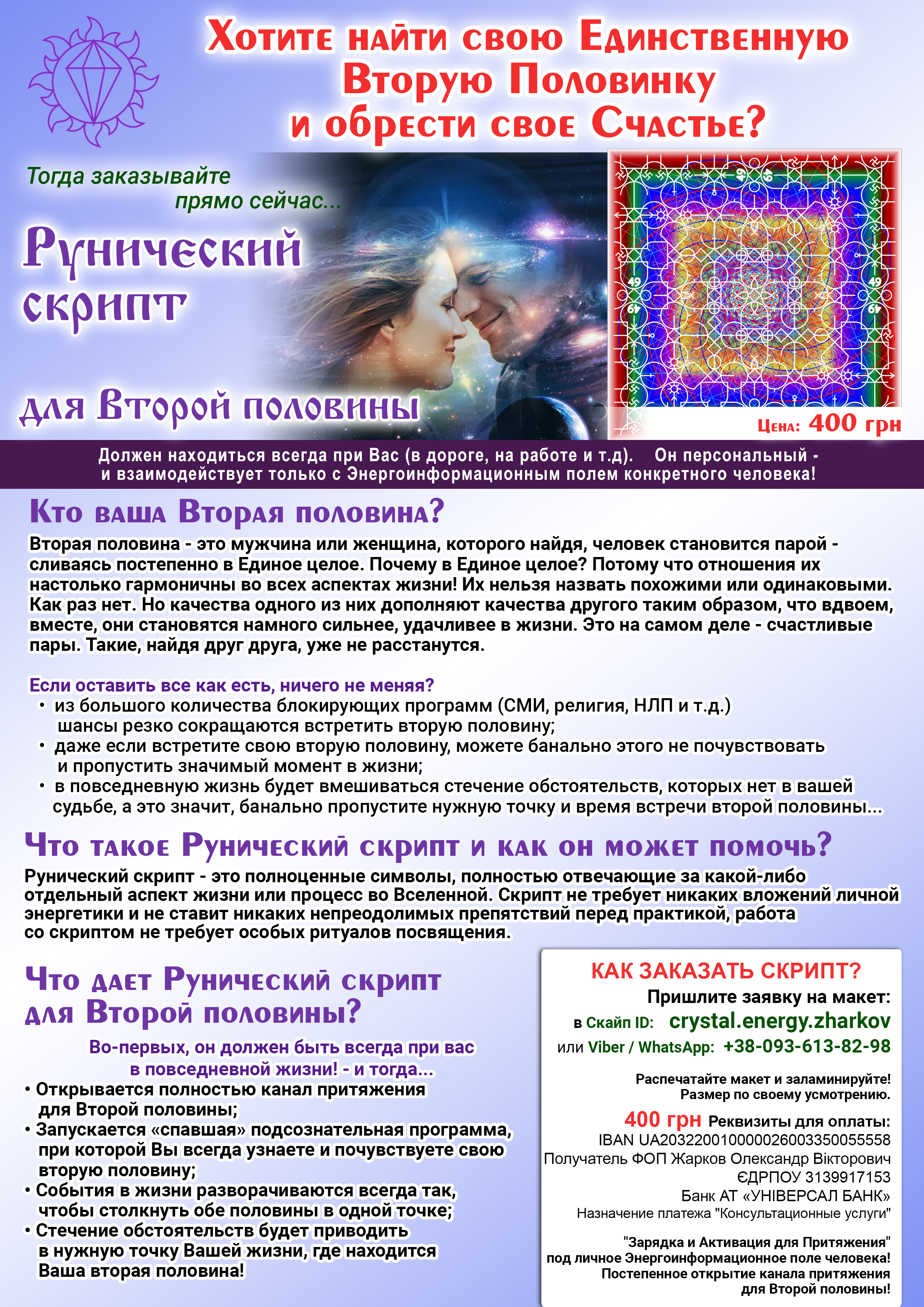 - Запрос на макет по любым удобным Вам координатам в разделе Контакты с текстом: "Рунический скрипт для Второй половины"